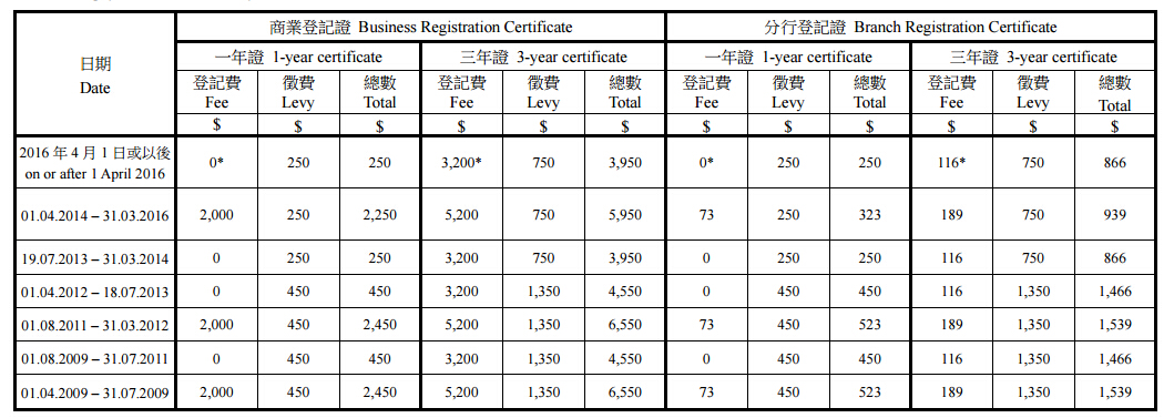 稅務局 Inland Revenue Department 商業登記費及徵費收費表 Business Registration Fee and Levy Table 收費基準商業登記證分一年有效期及三年有效期兩種,除經一站式公司註冊及商業登記服務成立的本地公司外,應繳金額以登記證的開始生效日釐訂。對於非本地公司新開業務,其首張登記證的開始生效日期是有關業務的開業日期,不是申請商業登記或分行登記日期。於一站式公司註冊及商業登記服務下成立的本地公司,其首張商業登記證的應繳金額是以其向公司註冊處提出相關的成立法團遞呈日期釐訂,而該登記證的開始生效日期是它的註冊日期。至於其後發出的續證,應繳金額則以續證的開始生效日釐訂。